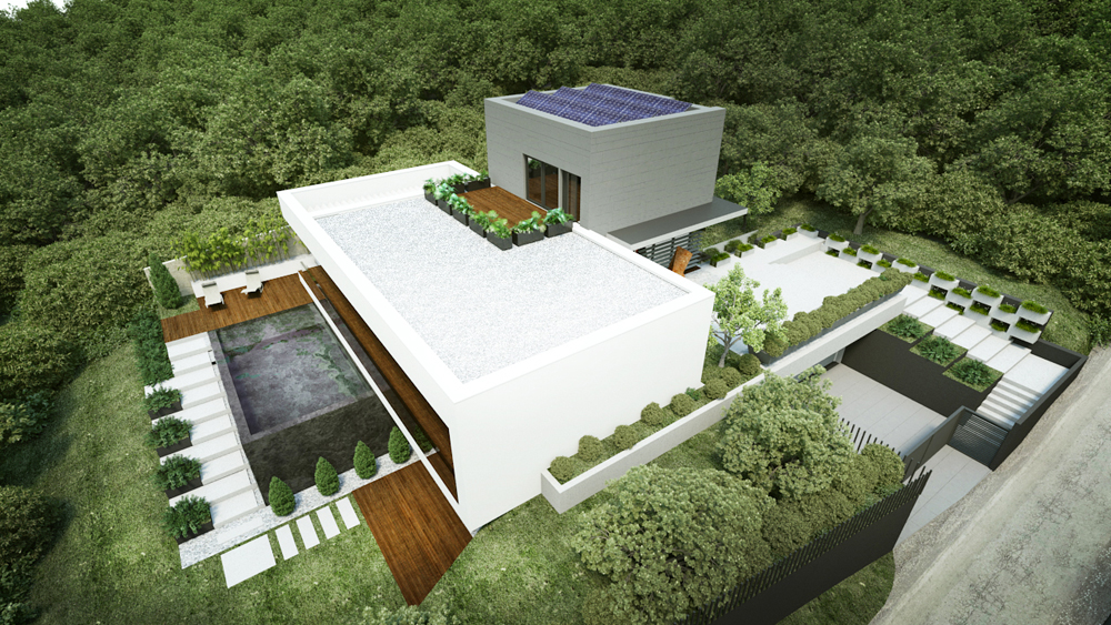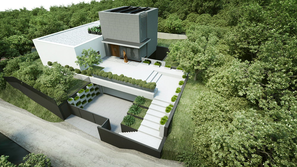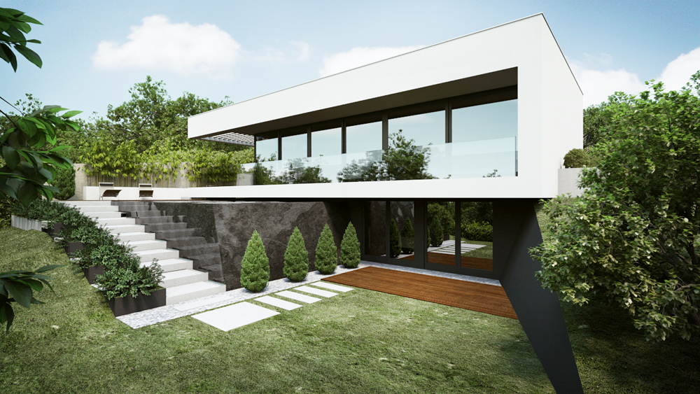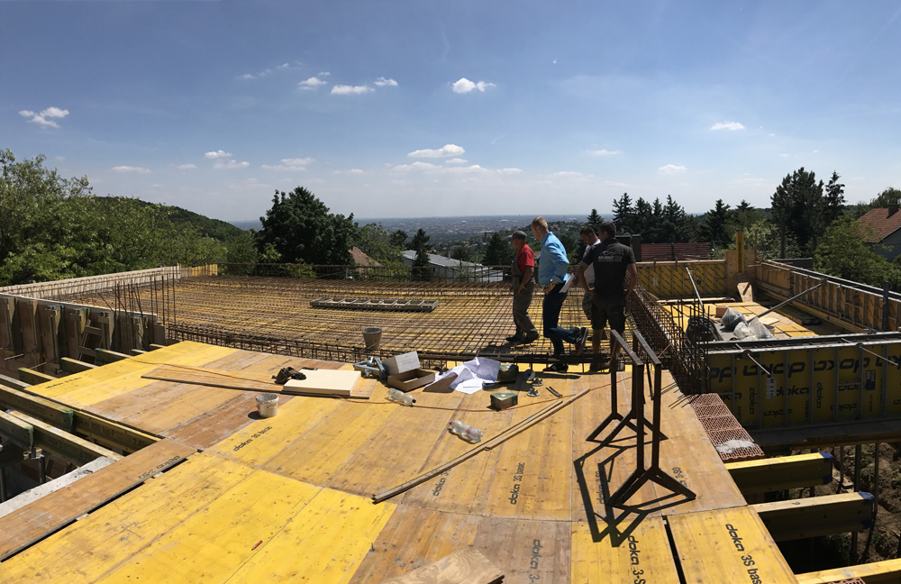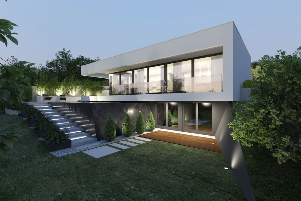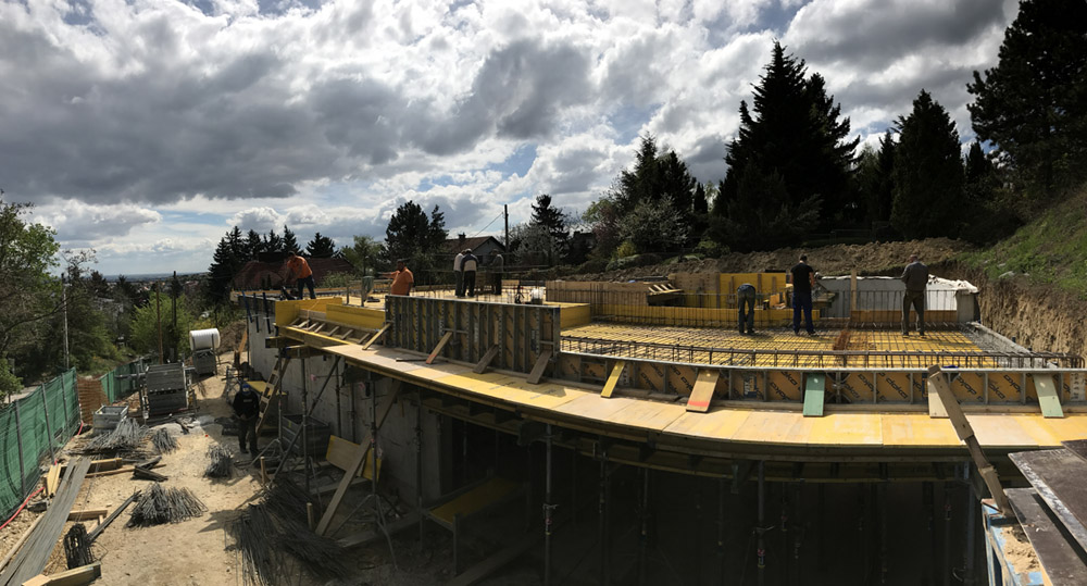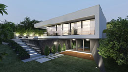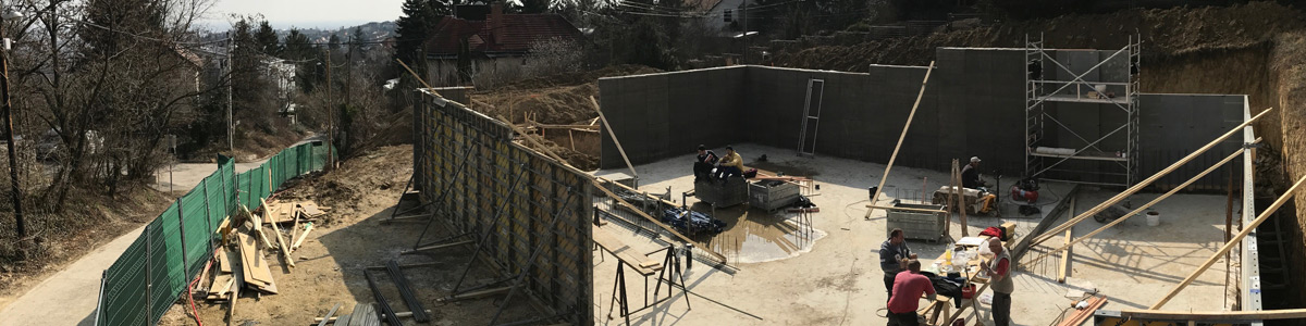 Telek: A budai dombok legszebb részén Pálvölgyön építünk egy minimál típusú családi villát. A telek elhelyezkedése teljesen egyedi, mivel a telek terepszintje az utcához képes 2 m magasan van, így onnan rálátás nem lehetséges. Saroktelek mivolta miatt szomszédok tekintetében is szerencsés, mert csak 2 db szomszéd van, de azok sem látnak rá a telekre, mivel a telkeken lévő házak sokkal feljebb helyezkednek el. A telek teljesen intim hangulatú és panorámás.